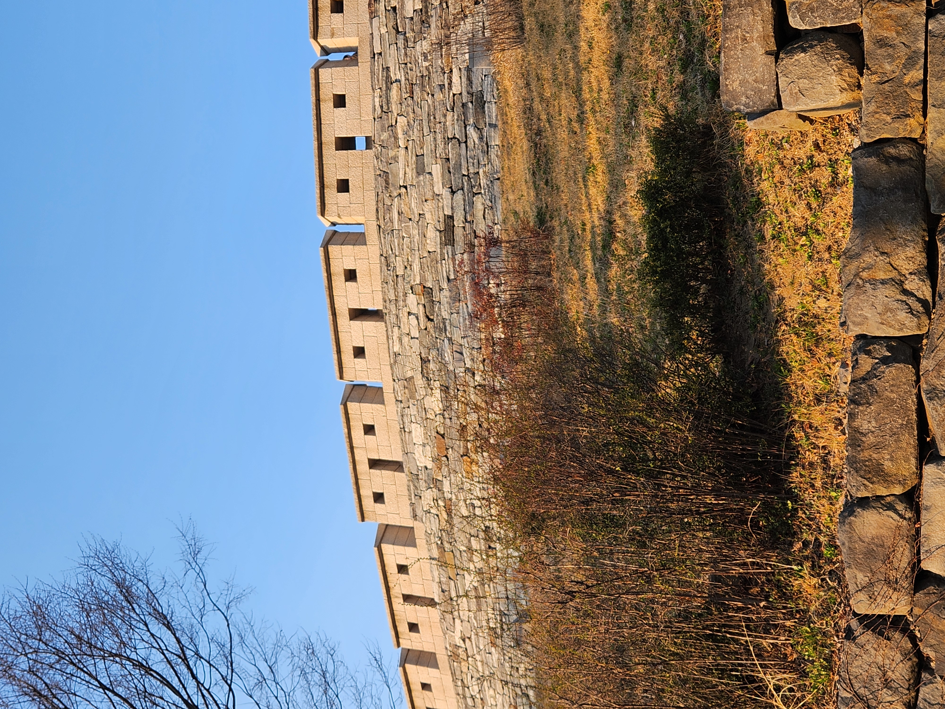 돌담과 마른 풀, 겨울 끝자락의 색감이 어우러져서