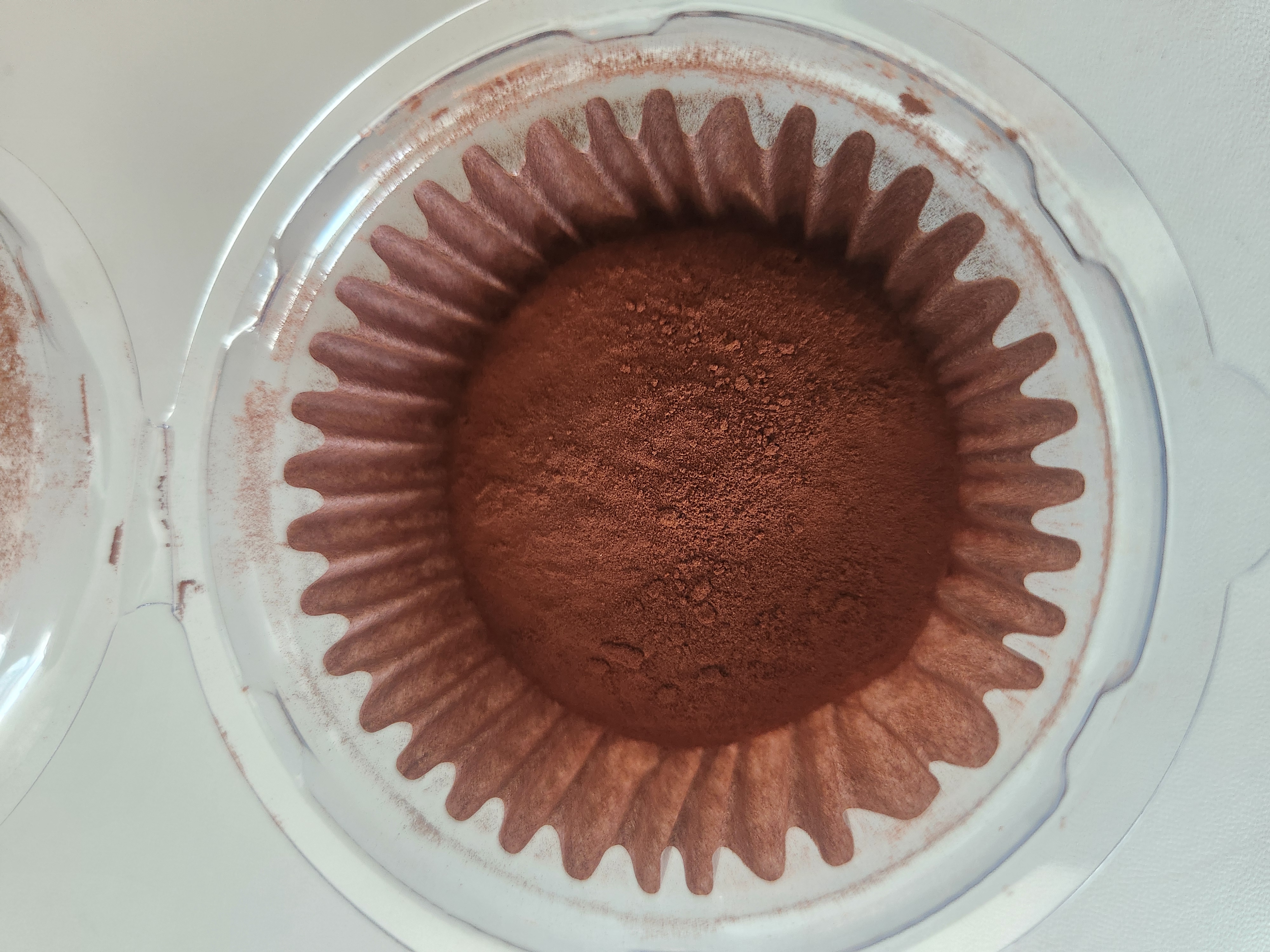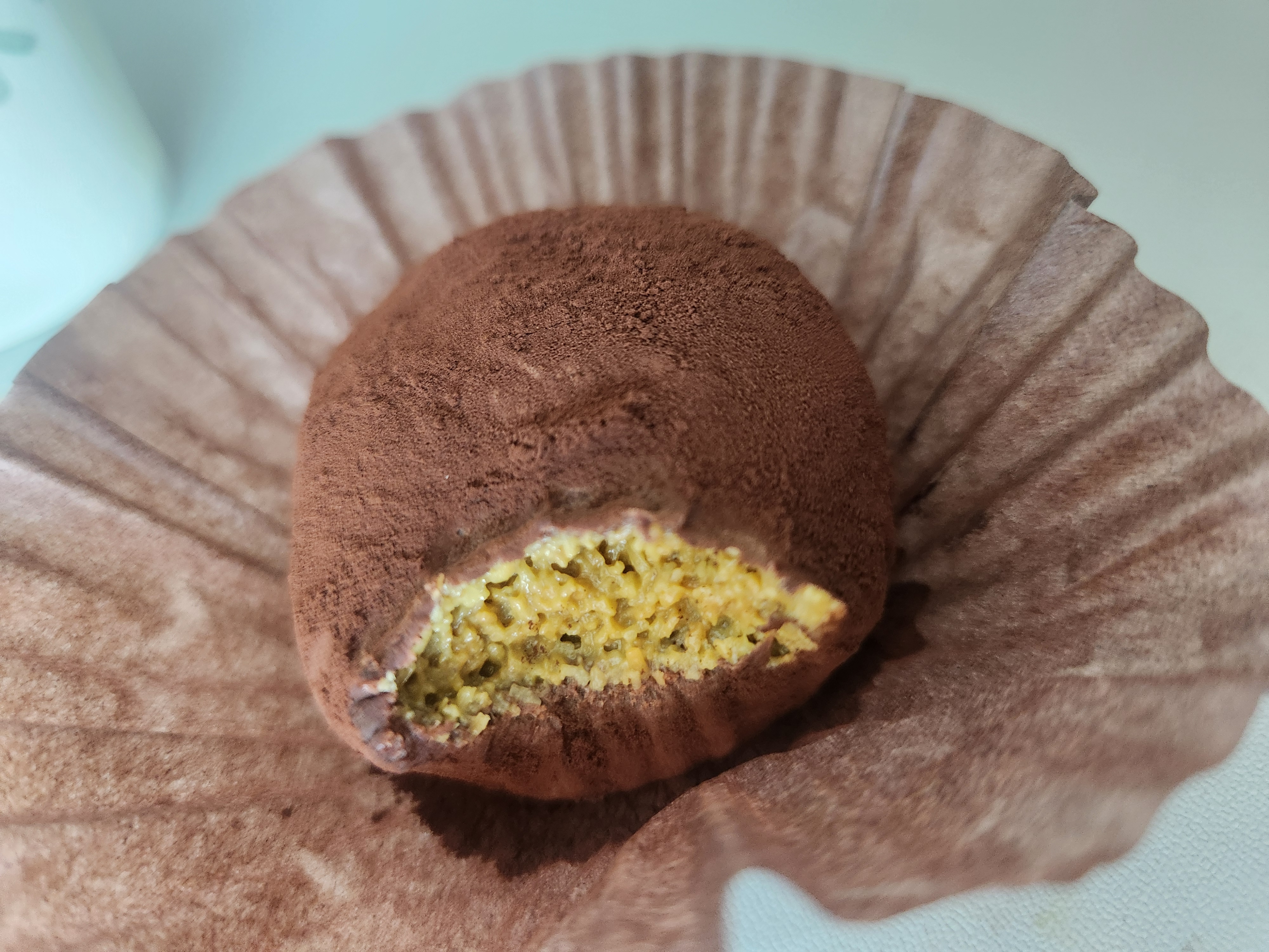 포장을 열어보면 코코아 파우더가 듬뿍 묻어 있는 둥근 디저트가 종이컵 안에 들어 있습니다.