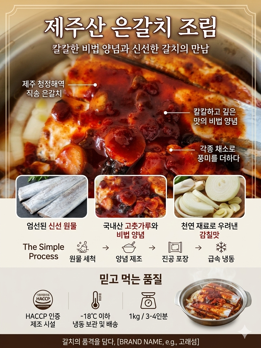 * 텍스트 가독성: '제주산 은갈치 조림'이라는 메인 카피가 사진과 잘 어우러지도록 배치되었습니다.